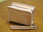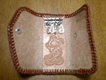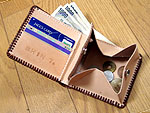 | 小銭とカードが2枚程度はいるコンパクトなものということで作ってみました。余り革を使ってデザインもの初挑戦。実はソフトサドルってーいう革に穴があったので。ただ、失敗だったのはサドルがソフトだったこと。もそっと堅い方が良かったね。 |