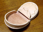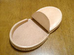 | 写真左は第1号。職場の先輩、市さんの小銭入れが壊れたので、それを型にして作ってみました。斜めに開ける目打ちに苦労しました。 写真右は第2号。型紙に起こしていなかったり、使う革が毎回違ったりで形も微妙に違います。内革に色気だしてみました。某先輩の転出の餞別に。 |