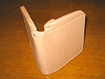 | 写真左、中。デザイン集からネタを拾って作ってみましたが、本当に小銭しか入らない!でも思ったより可愛くなったので職場の後輩にプレゼントしました。写真右。で、横幅を広げて4つ折りの紙幣が入るサイズにした改良品。妻と揃いです。 |