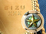| 写真左)デザインが固まらなくて躊躇していたのですが、転勤も近いので思い切って。基本的な形は2つ同じですが、素材に合わせて多少替えました。写真中)sizu用の裏にはこんな刻印。トリプルエックスでななく、30歳記念ということで。あぅぅ・・・コンチョの抜いてある部分には蛇革もどきを入れました。写真右)四つ編みのひもは手提げではなく本体の脱落防止のためのハーネスです。 |